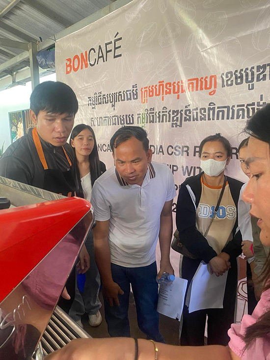 V Sron currently runs a small bakery with his wife, and last year attended a barista training hosted by DDP with Bon Cafe. (V Sron, center, wearing a white shirt.)